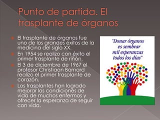 El documento habla sobre los trasplantes de órganos, que comenzaron a realizarse con éxito en 1954 con un riñón y en 1967 con un corazón. Los trasplantes mejoran la vida de los pacientes pero presentan problemas como el rechazo inmunológico y la escasez de órganos. También discute sobre la clonación, el desarrollo embrionario y la reproducción asistida como la fecundación in vitro e inseminación artificial.