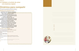 El documento habla sobre la virtud de la castidad y cómo se desarrolla a lo largo de la vida. Explica que la castidad en la infancia y adolescencia implica controlar los impulsos pasionales de manera progresiva a medida que se crece. En el noviazgo y matrimonio, la castidad significa unir el dinamismo carnal y espiritual para integrar el amor en la caridad y cumplir con el doble fin del matrimonio: la unidad y la procreación. También presenta las etapas de la castidad y los