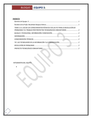 Este documento presenta información sobre tecnología, información, innovación, conocimientos técnicos, TIC, resolución de problemas y proyectos tecnológicos comunitarios. Explica que la información y el uso de las TIC son fundamentales para resolver problemas en procesos productivos a través de cuatro pasos: planteamiento del problema, investigación, aportaciones y diseño del plan de trabajo. También define conceptos clave como conocimientos técnicos, TIC, resolución de problemas y proyectos tecnológicos comunitarios.