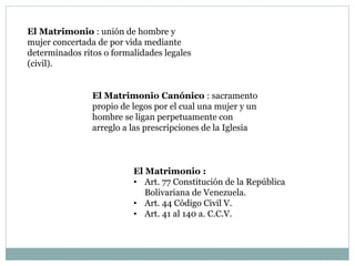 Este documento describe los elementos y efectos del matrimonio y la unión estable de hecho según la ley venezolana. Define el matrimonio como la unión de un hombre y una mujer mediante ritos legales, menciona sus elementos necesarios como el consentimiento y la diferencia de sexo, y sus causas de disolución como la muerte o el divorcio. También describe la unión estable de hecho o concubinato, sus elementos y efectos patrimoniales como derechos sucesorios. Finalmente, aborda temas como el matrimonio fuera