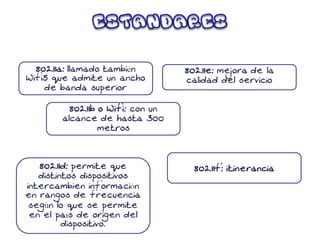 Este documento describe diferentes tipos de redes, incluyendo redes de área amplia, redes metropolitanas, redes locales e inalámbricas. Explica que las redes conectan computadoras para compartir recursos e información. También proporciona detalles sobre los estándares Wi-Fi y Wi-Fi Alliance creados para promover la tecnología inalámbrica.