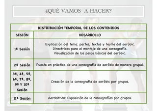 El documento detalla un plan de educación física centrado en una unidad sobre aeróbic, que incluye sesiones para aprender y crear coreografías en grupo. Se discuten los beneficios del aeróbic y sus distintos tipos, así como la estructura y los pasos básicos de una clase. También se presentan criterios para la creación de coreografías y aspectos logísticos para su presentación final.