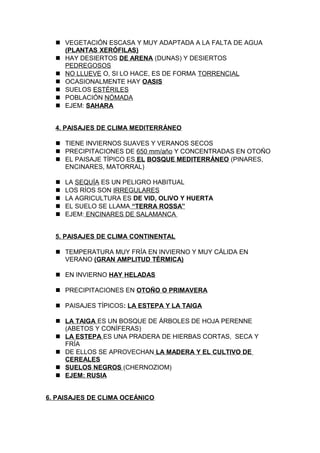 El documento describe los diferentes tipos de paisajes de la Tierra según su clima, incluyendo la selva ecuatorial, la sabana tropical, los desiertos, el clima mediterráneo, continental, oceánico, polar y de alta montaña. Cada clima se caracteriza por sus temperaturas y precipitaciones típicas y los paisajes vegetales asociados como la selva, sabana, bosque mediterráneo, estepe, tundra o pradera alpina.