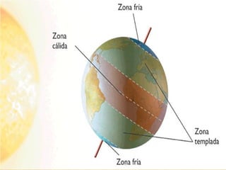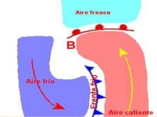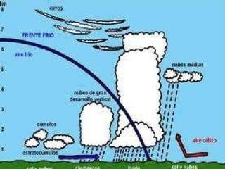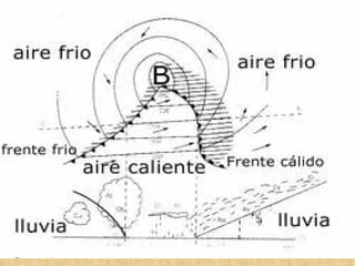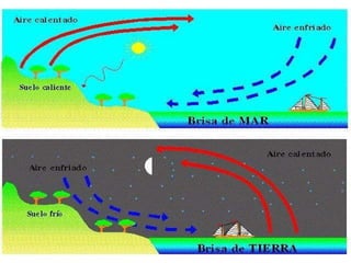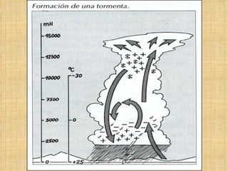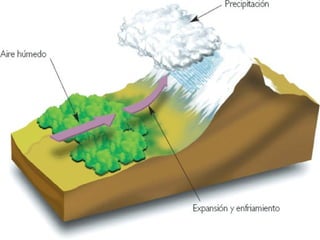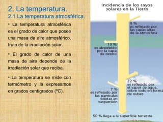 El documento habla sobre los factores que afectan la temperatura y el clima como la latitud, la acción del mar, y la altitud. Explica que la temperatura disminuye a medida que aumenta la altitud. También describe los factores que determinan la humedad del aire y las precipitaciones como la condensación del vapor de agua y la formación de nubes. Por último, explica cómo se mide la presión atmosférica y los tipos de vientos.