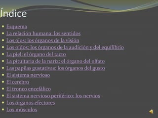 Este documento resume los principales órganos y sistemas relacionados con los sentidos humanos y la relación. Explica que los órganos de los sentidos como los ojos, oídos, piel, nariz y lengua captan estímulos y envían señales al sistema nervioso. El sistema nervioso procesa estas señales y envía órdenes a los efectores como los músculos para producir respuestas.
