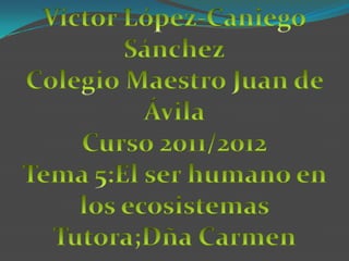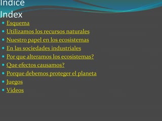 El documento describe cómo los seres humanos interactúan con los ecosistemas. Actualmente, nuestra gran población y alta demanda de recursos están alterando gravemente los ecosistemas, causando una pérdida de biodiversidad, la destrucción de hábitats y el cambio climático. Debemos proteger el planeta explotando los recursos de forma sostenible y protegiendo las especies en peligro para asegurar que la Tierra siga siendo habitable.