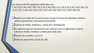 El documento presenta los resultados del ejercicio de pH sanguíneo de 30 personas. Incluye una tabla de frecuencia con los valores de pH, y cálculos de media, mediana y moda totales y por sexo. También incluye el cálculo de cuartiles, percentiles 10, 50, 70 y 80.