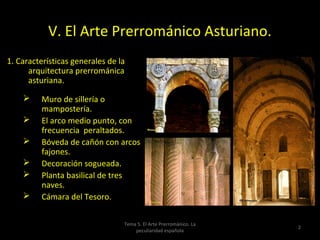 El documento describe el arte prerrománico en España, incluyendo las características del arte asturiano y mozárabe. El arte asturiano se caracteriza por muros de sillería, arcos de medio punto, bóvedas de cañón y decoración sogueada. El arte mozárabe utiliza arcos de herradura, bóvedas de nervios y gallonada, y grandes aleros con modillones. El documento también muestra imágenes de varias iglesias prerrománicas como Santa María del Naranco, San Miguel de Lillo y San