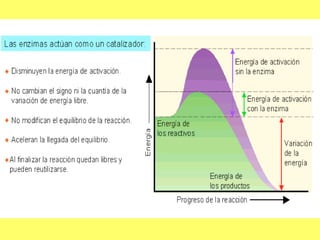 Este documento presenta información sobre los biocatalizadores, en particular las enzimas. Explica las propiedades y características de las enzimas, incluyendo su estructura, especificidad, mecanismos de acción y tipos de reacciones catalizadas. También describe los modelos de unión enzima-sustrato y los pasos de las reacciones enzimáticas, así como los factores que afectan la velocidad de las reacciones catalizadas por enzimas.