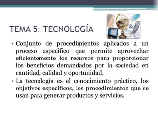 Este documento describe conceptos clave sobre tecnología y su administración en las empresas. Explica que la tecnología se refiere a los procedimientos aplicados a procesos específicos para aprovechar los recursos de manera eficiente. También discute estrategias tecnológicas como el liderazgo tecnológico, tipos de innovación, factores que afectan la innovación y el ciclo de vida de la tecnología. Además, ofrece lineamientos para la selección, valoración e inversión en nuevas te