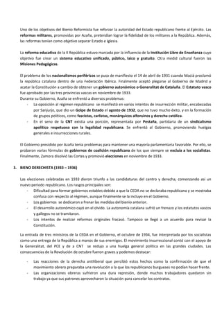 La Segunda República Española (1931-1936) intentó modernizar España y adecuarla a los cambios sociales y económicos. Hubo un bienio reformista liderado por Azaña que promovió reformas sociales, laborales y educativas, y un bienio derechista posterior marcado por la inestabilidad. En 1936, el Frente Popular ganó las elecciones pero conspiraciones militares llevaron a la Guerra Civil tras el golpe del 17 de julio.