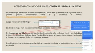 Este documento proporciona instrucciones para realizar una actividad con Google Maps. Explica cómo buscar direcciones y obtener indicaciones para llegar de un punto a otro. Primero, se debe acceder al mapa de calles de Ciudad Real. Luego, buscar la dirección de partida y destino. Finalmente, se deben anotar las indicaciones que proporciona la aplicación.