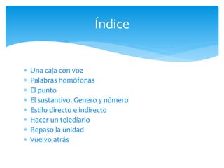 Este documento presenta una serie de temas sobre el lenguaje incluyendo una caja que habla, palabras homófonas, el uso del punto, género y número de sustantivos, estilo directo e indirecto, cómo hacer un telediario, y ejercicios de repaso sobre estas ideas. El documento proporciona información básica sobre cada uno de estos temas a través de una serie de secciones breves.