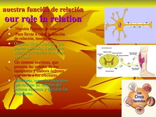 Nuestro cuerpo tiene órganos sensoriales que captan estímulos, un sistema nervioso que procesa la información sensorial y envía órdenes a los efectores, y efectores como los músculos que ejecutan las respuestas. El sistema nervioso está formado por el sistema nervioso central (encéfalo y médula espinal) y el sistema nervioso periférico (nervios). Los efectores como los músculos y el esqueleto permiten la locomoción y otros movimientos.