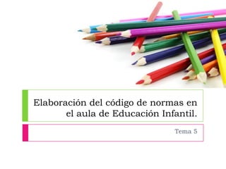 Este documento describe las normas en la educación infantil. Explica que las normas son reglas que deben seguir los niños para adaptarse a la sociedad y que les ayudan a sentirse seguros. Además, detalla cómo deben elaborarse las normas de forma conjunta entre los niños y maestros y cómo deben aplicarse de una manera positiva y con consecuencias adecuadas. Finalmente, proporciona ejemplos de materiales y recursos para reforzar las normas en el aula.