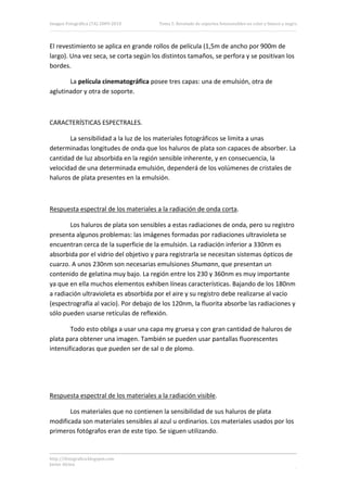 Este documento resume los principales aspectos del revelado de soportes fotosensibles en blanco y negro y color. Explica que la luz es esencial en fotografía y que los materiales fotográficos usan haluros de plata sensibles a la luz. Detalla el proceso de formación de la imagen latente y las capas de las películas. Además, describe la sensibilidad espectral de los materiales a diferentes longitudes de onda de luz y los métodos para modificar dicha sensibilidad.