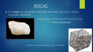 Este documento describe los diferentes tipos de rocas, incluyendo rocas ígneas, sedimentarias y metamórficas. Explica que las rocas ígneas se forman cuando el magma se enfría y solidifica, las sedimentarias se forman por la compactación de sedimentos, y las metamórficas se forman por la transformación de otras rocas debido a altas presiones y temperaturas. También describe los usos comunes de las rocas como materiales de construcción, combustibles fósiles y en la industria.