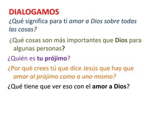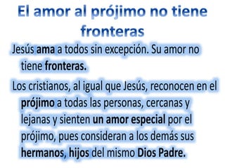 El documento habla sobre el amor a Dios y al prójimo según las enseñanzas de Jesús. Jesús enseñó que el mandamiento principal es amar a Dios sobre todas las cosas y amar al prójimo como a uno mismo. También presenta historias de Jesús mostrando amor a personas marginadas como la samaritana, Zaqueo y Bartimeo.