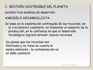 El documento describe tres modelos de desarrollo (desarrollista, conservacionista y sostenible) y explica por qué es necesario un cambio hacia la gestión sostenible del planeta debido al deterioro ambiental y la desigualdad. También resume las características del desarrollo sostenible, incluyendo la sostenibilidad ecológica, económica y social, y los compromisos internacionales para promoverla.
