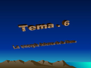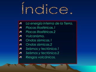 El documento describe la energía interna de la Tierra y los procesos geológicos asociados. Explica que la litosfera está dividida en placas tectónicas que se mueven, causando fenómenos como el vulcanismo y los terremotos en los límites de placas. Los terremotos ocurren cuando la tensión acumulada en los límites de placas es liberada, generando ondas sísmicas. El documento también cubre los riesgos asociados con los terremotos y la actividad volcánica.