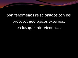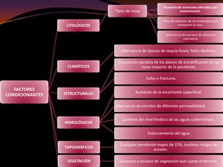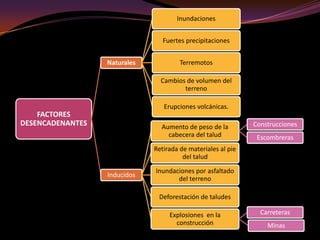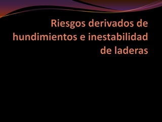 Este documento describe varios tipos de riesgos derivados de movimientos de terrenos como hundimientos, deslizamientos e inestabilidad de laderas. Explica fenómenos como subsidencias, suelos expansivos, diapiros y diferentes tipos de movimientos de laderas, así como medidas preventivas y correctoras para cada uno. Los riesgos incluyen pérdidas de vidas y daños a infraestructura cuando estos fenómenos se desencadenan.