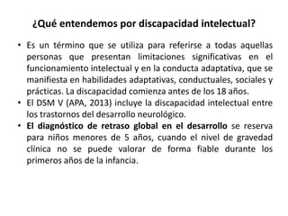Este documento trata sobre los alumnos con discapacidad intelectual y retrasos en el desarrollo en Educación Infantil. Explica que la discapacidad intelectual implica limitaciones en el funcionamiento intelectual y la conducta adaptativa que comienzan antes de los 18 años. También describe las causas más comunes como factores biomédicos, sociales y educativos, y el papel del maestro en detectar retrasos en el desarrollo e implementar adaptaciones curriculares. Además, ofrece orientaciones metodológicas