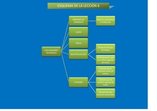 Este documento explica los números decimales y las operaciones básicas con ellos. Introduce los números decimales como fracciones decimales y explica cómo sumar y restar decimales colocándolos en columnas. Luego, detalla cómo multiplicar decimales realizando la operación como números enteros y separando cifras decimales en el producto según los factores. Finalmente, cubre cómo dividir un decimal entre un entero y también cómo dividir dos decimales transformando el divisor a un entero.