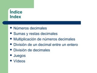 Este documento presenta información sobre números decimales. Explica las operaciones básicas con números decimales como sumas, restas, multiplicaciones y divisiones. También incluye enlaces a juegos y videos interactivos para practicar conceptos como órdenes de unidades decimales y realizar cálculos con decimales.