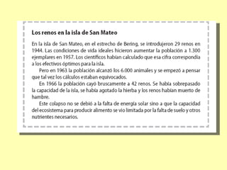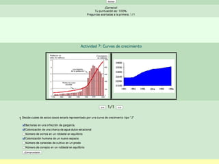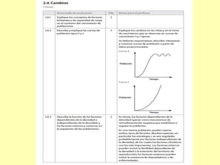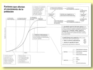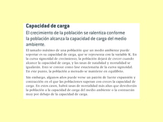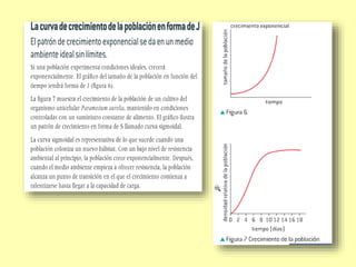 Este documento describe los modelos de crecimiento poblacional exponencial y logístico, así como los factores que regulan el tamaño de las poblaciones como el potencial biótico, la resistencia ambiental y la capacidad de carga. También analiza las curvas de crecimiento en J y S y los tipos de curvas de supervivencia.