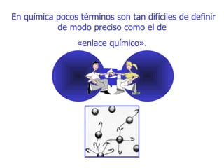 El documento resume las principales teorías sobre el enlace químico según Linus Pauling, Sir Isaac Newton y la Enciclopedia Británica. Explica que los enlaces químicos ocurren cuando los átomos alteran su estructura electrónica para unirse a otros átomos, ganando estabilidad al lograr la configuración de un gas noble. También describe los conceptos de potencial de ionización, afinidad electrónica e introduce las clasificaciones de enlaces iónicos, covalentes y metálicos.