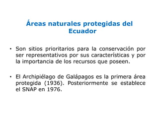 Ecuador cuenta con 48 áreas naturales protegidas, representando aproximadamente el 20% de su territorio, las cuales son gestionadas a través del Sistema Nacional de Áreas Protegidas (SNAP) creado para conservar la biodiversidad. Entre las categorías de manejo se incluyen parques nacionales, reservas biológicas y marinas, así como bosques protectores. Además, el país alberga hotspots de biodiversidad y cuatro reservas de biósfera declaradas por la UNESCO.