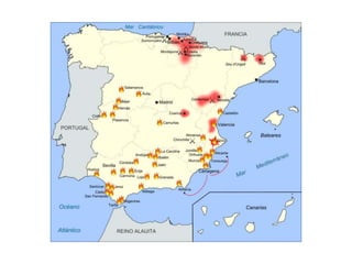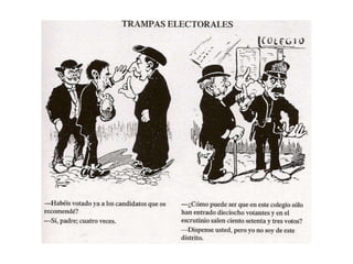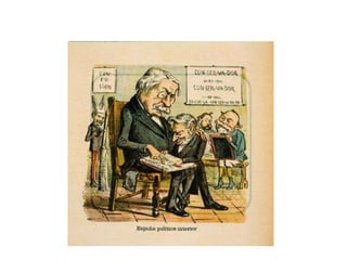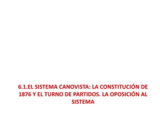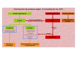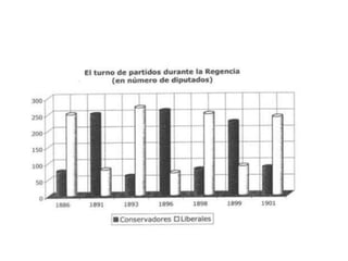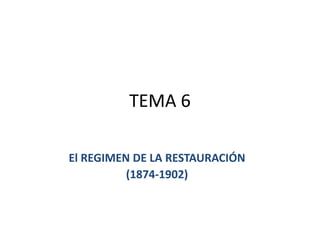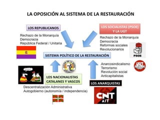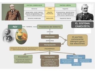 El documento aborda el régimen de restauración en España (1874-1902), centrado en el sistema canovista y la inestabilidad política del periodo, incluyendo el establecimiento de la constitución de 1876 y el turno de partidos. Se analizan las guerras de Cuba, el conflicto con Estados Unidos y la crisis de 1898, así como el surgimiento de movimientos nacionalistas y obreros en respuesta a la centralización política. Concluye con una crítica a la oligarquía y el caciquismo, enfatizando la necesidad de reformas educativas y modernización.