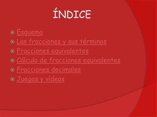 Este documento presenta un resumen de las fracciones y sus términos. Explica qué son las fracciones equivalentes y cómo calcularlas mediante la multiplicación o división de los términos de la fracción por el mismo número. También introduce las fracciones decimales y cómo representarlas como números decimales. Por último, proporciona enlaces a juegos y videos sobre fracciones.