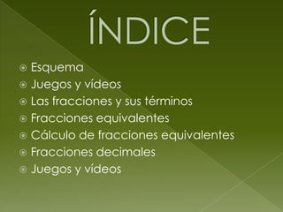 Este documento proporciona información sobre fracciones. Explica los términos de una fracción como numerador y denominador. Describe cómo calcular fracciones equivalentes mediante amplificación y simplificación. También cubre la comparación de fracciones, fracciones decimales y la relación entre fracciones y números decimales. Incluye ejemplos para ilustrar los conceptos.