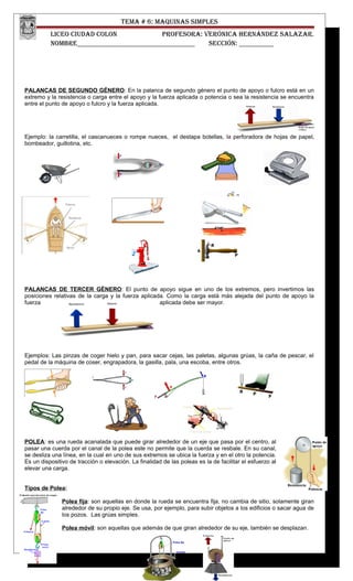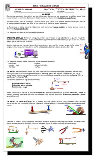 Este documento proporciona información sobre máquinas simples. Define máquinas como dispositivos que se utilizan para transformar fuerzas mediante aumento o disminución. Describe seis tipos de máquinas simples: palancas, poleas, ruedas y ejes, planos inclinados, tornillos y cuñas. Explica cada una de estas máquinas simples y proporciona ejemplos de cada una.
