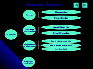 Este documento describe las fracciones, incluyendo sus términos (numerador y denominador), fracciones equivalentes, comparación de fracciones, y conversión a fracciones decimales. Explica que una fracción representa partes iguales de una unidad dividida, y que fracciones equivalentes representan la misma parte de la unidad a través de amplificación o simplificación. También introduce fracciones mayores, iguales o menores que la unidad, y la conversión de fracciones a números decimales cuando el denominador incluye ceros.