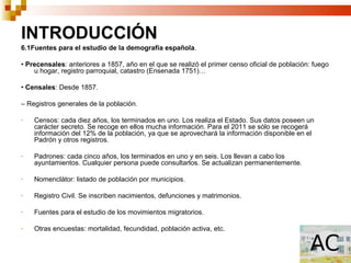 Este documento resume la evolución de la población en España desde 1900. Explica los diferentes regímenes demográficos por los que ha pasado España y cómo han cambiado las tasas de natalidad y mortalidad. También describe la distribución espacial de la población en España y las diferencias de densidad entre las diferentes comunidades autónomas. Por último, define los conceptos y tasas utilizadas para medir los movimientos naturales de la población como la natalidad, fecundidad, mortalidad e índice de envejecimiento.