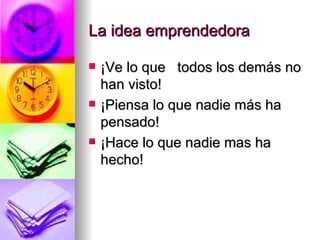 Este documento describe diferentes técnicas para generar ideas creativas como la tormenta de ideas y el pensamiento lateral. También discute el proceso de pensamiento creativo que incluye recopilar información, reelaborarla y llegar a una inspiración o iluminación. Además, presenta una lista de atributos como un método para desarrollar ideas y cubre los pasos iniciales para comenzar un nuevo proyecto empresarial como describir la idea y analizar a los posibles consumidores.