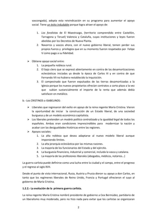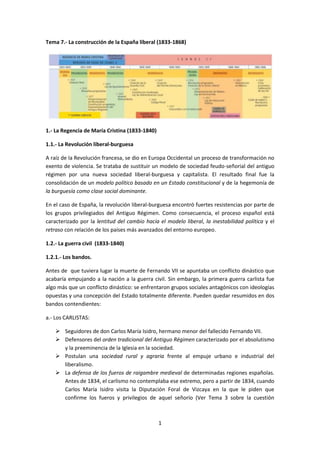 Este documento describe el proceso de construcción del Estado liberal en España entre 1833 y 1868. Explica que tras la muerte de Fernando VII en 1833 comenzó la Regencia de María Cristina, un periodo caracterizado por la guerra civil entre carlistas, partidarios del tradicional Antiguo Régimen, y liberales isabelinos, que apoyaban el nuevo modelo liberal-burgués. También analiza la división del liberalismo español en moderados y progresistas, y los intentos de establecer una constitución a través del Estatuto Real de 1834 y la Con