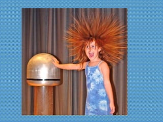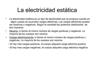 La electricidad estática se produce cuando un cuerpo acumula cargas eléctricas positivas o negativas. Los materiales pueden ser conductores u aislantes de la electricidad. Un circuito eléctrico necesita un generador, conductores y aparatos, y puede estar abierto o cerrado por un interruptor. La corriente eléctrica tiene usos como producir luz, calor, movimiento y comunicaciones.