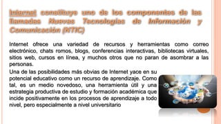 El documento describe las diversas herramientas y recursos educativos que ofrece Internet, incluyendo correo electrónico, chats, blogs, cursos en línea y más. Explica que Internet tiene un gran potencial educativo como recurso de aprendizaje al ser una herramienta útil que puede mejorar los procesos de aprendizaje a todo nivel, especialmente en educación universitaria. Además, señala que es importante que los docentes guíen a los estudiantes en el uso crítico de la información disponible en Internet.