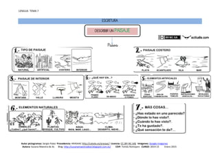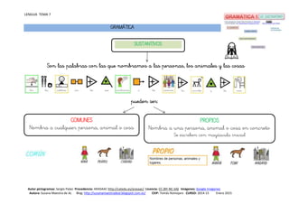 El documento trata sobre la gramática, ortografía y vocabulario en el contexto de la lengua, presentado con pictogramas por Sergio Palao. Se discuten los tipos de sustantivos, la descripción de paisajes y la formación de palabras compuestas. Está destinado a un contexto educativo, específicamente para el curso 2014-15 en el CEIP Tomás Romojaro.