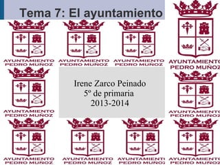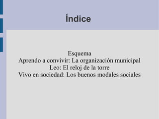 El documento trata sobre el tema de la organización municipal. Explica que un ayuntamiento es la institución que gobierna un municipio independientemente de su tamaño o número de habitantes. También incluye un cuento sobre una niña que siempre miraba el reloj de la torre del pueblo y una sección sobre la importancia de los buenos modales sociales al realizar visitas.