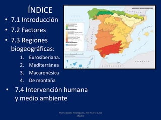 Este documento describe las principales regiones biogeográficas de España. Identifica cuatro regiones: la región eurosiberiana, que se extiende desde Galicia hasta los Pirineos y se caracteriza por un clima atlántico y vegetación como robles y hayas; la región mediterránea, con clima seco y vegetación esclerófila como encinas y alcornoques; la región macaronésica, que incluye las islas Canarias y se divide en pisos de vegetación según la altitud; y la región alpina de montaña,