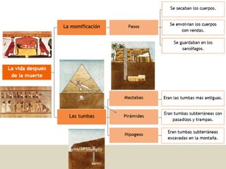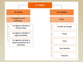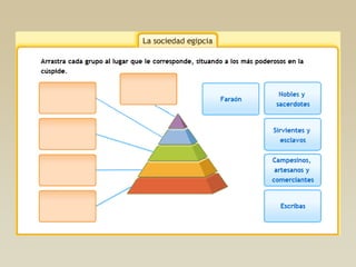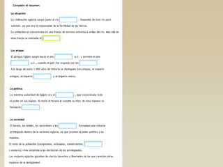 El documento resume la historia y sociedad del antiguo Egipto. El Egipto surgió hace más de 5,000 años en el noreste de África, a lo largo del río Nilo. La sociedad egipcia estaba dividida en dos grupos: los privilegiados como faraones, nobles y sacerdotes; y los no privilegiados como campesinos, artesanos y esclavos. Los egipcios creían en dioses como Ra, Osiris e Isis y construyeron templos y pirámides para honrarlos.