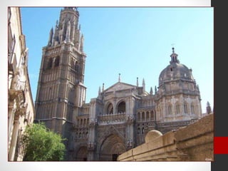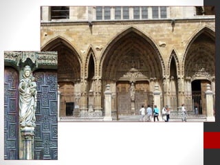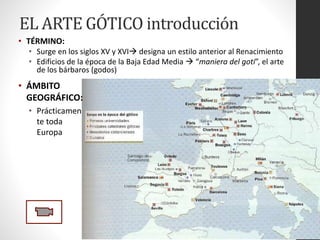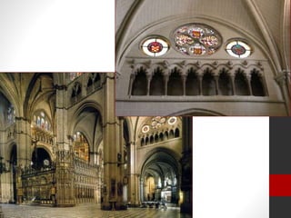 El arte gótico, surgido entre los siglos XII y XVI, se caracteriza por su arquitectura impresionante en catedrales y edificios civiles, reflejando un auge de las ciudades y el poder religioso. Elementos como el arco ojival y la bóveda de crucería permitieron crear espacios luminosos y esbeltos, simbolizando la aspiración espiritual de la época. En España, se desarrolló un estilo gótico singular influenciado por modelos franceses y alemanes, destacándose catedrales como las de Burgos, León y Toledo.