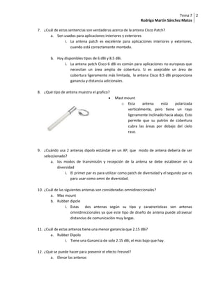 Este documento proporciona información sobre diferentes tipos de antenas inalámbricas como parabólicas, patch, yagi y dipolo. Explica sus características como ganancia, patrón de radiación, polarización y ángulo de cobertura. También cubre temas como el efecto de fresnel, distancia máxima entre enlaces, y factores que afectan el rendimiento como la longitud del cable y la interferencia electromagnética. El documento es una guía útil para la selección, instalación y configuración adecu