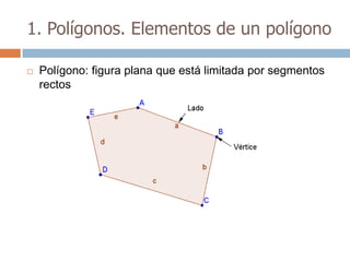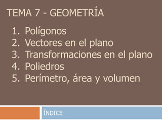 Este documento trata sobre geometría y contiene información sobre polígonos, vectores, transformaciones y poliedros. En la sección de polígonos se define qué es un polígono y sus elementos, y se explican conceptos como la suma de los ángulos interiores, bisectrices, medianas y más. También incluye ejemplos y ejercicios resueltos sobre triángulos y semejanza. Finalmente, presenta el teorema de Tales sobre la proporcionalidad de segmentos cortados por rectas paralelas.