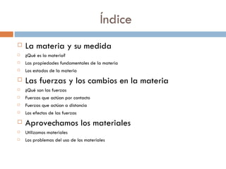 Este documento proporciona una introducción a la materia y sus propiedades. Explica que la materia es todo lo que forma el universo y ocupa espacio, y que tiene dos propiedades fundamentales: masa y volumen. También describe los tres estados de la materia (sólido, líquido y gaseoso), las fuerzas que actúan sobre la materia por contacto o a distancia, y algunos ejemplos de cómo los humanos aprovechan y utilizan diferentes materiales.