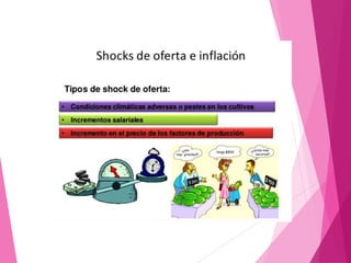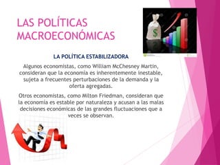 Este documento discute varios temas macroeconómicos clave como las políticas macroeconómicas, la deuda pública y los avances recientes en la teoría macroeconómica. Explica que la política económica busca la estabilización de la economía mediante el uso de la política monetaria y fiscal para contrarrestar perturbaciones. También analiza conceptos como el déficit fiscal, la deuda pública interna y externa, y los debates entre keynesianos y monetaristas sobre el efecto de las políticas. Por último, resume los